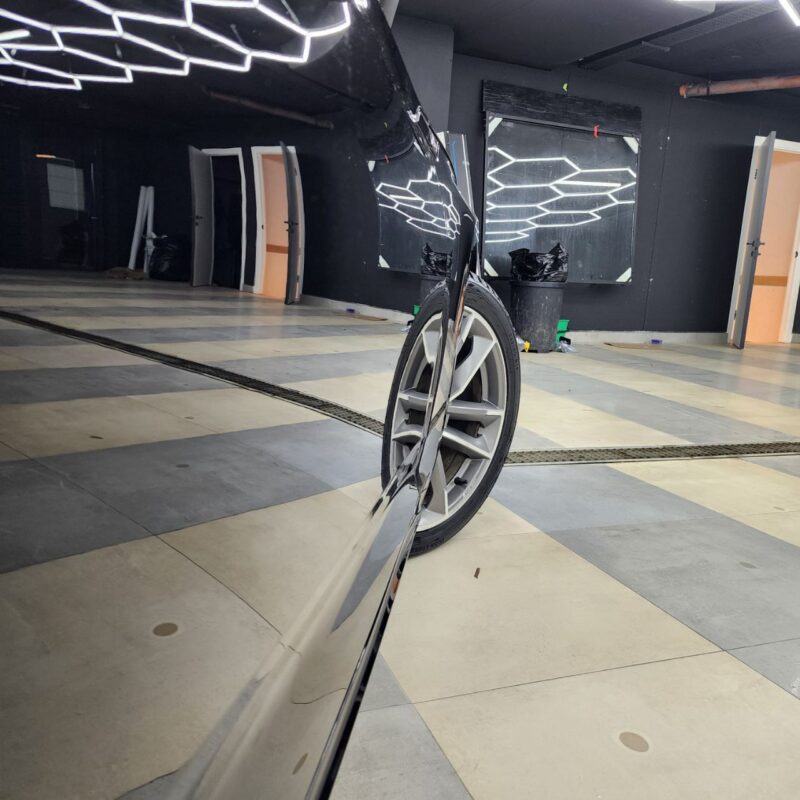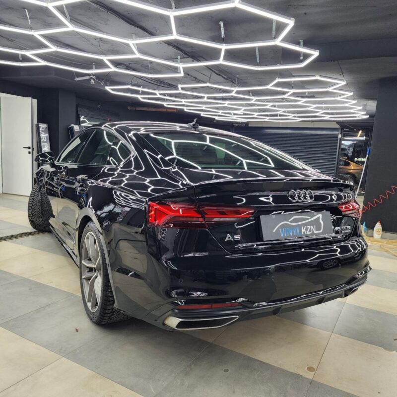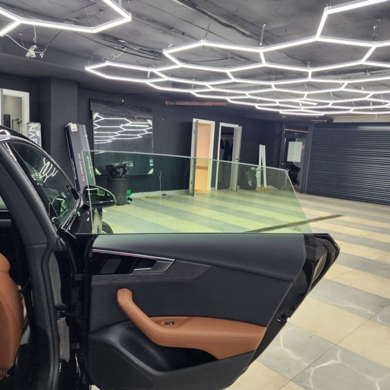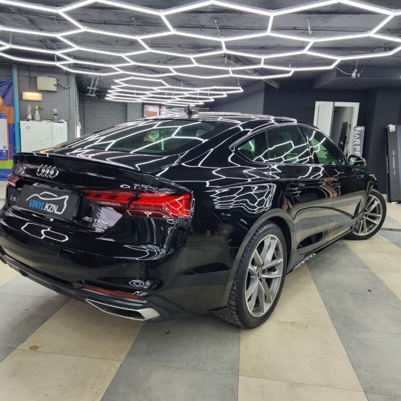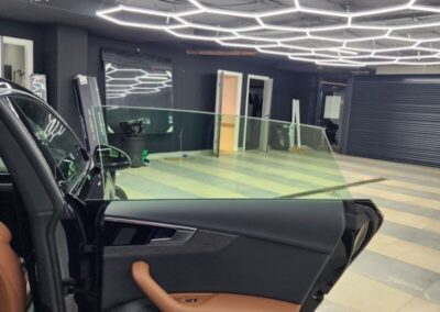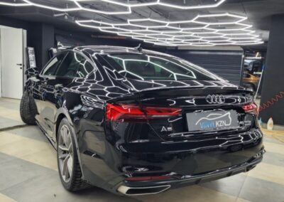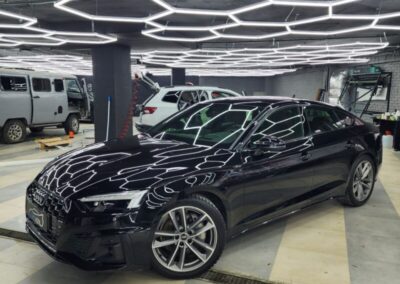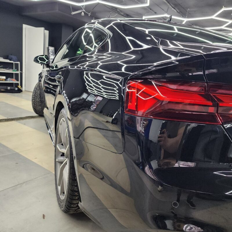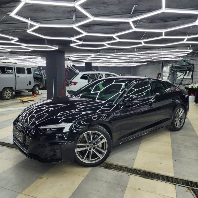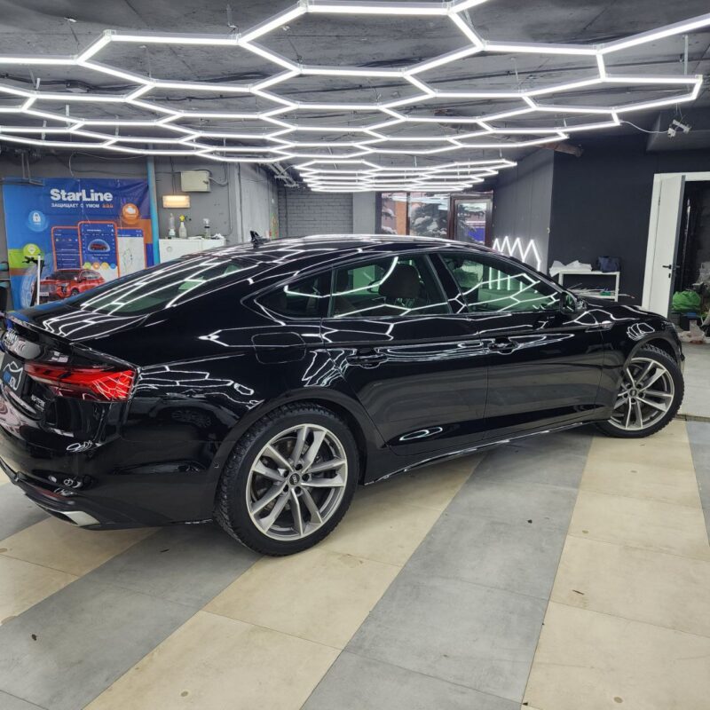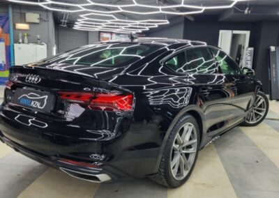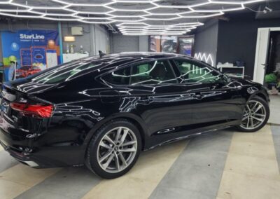 Audi A5 сделали полировку и нанесли два слоя керамики. Сняли тёмную тонировку с задней полусферы, затонировали все стекла атермальной плёнкой зеленоватого оттенка.