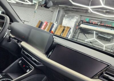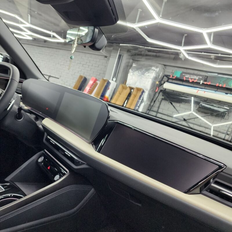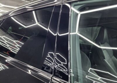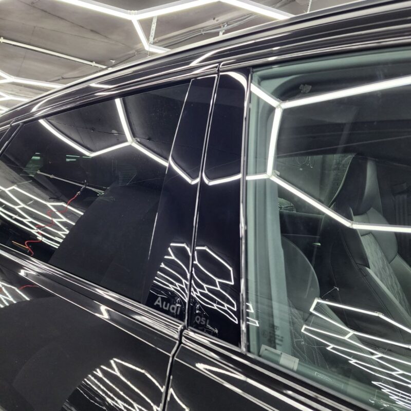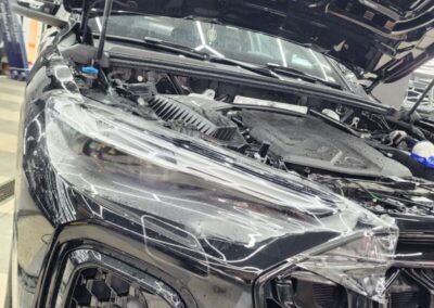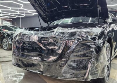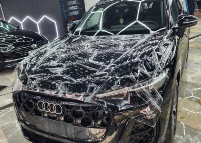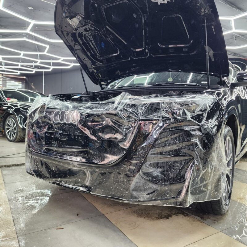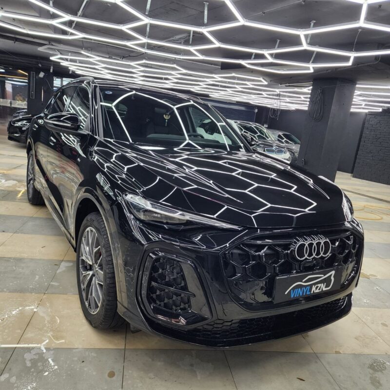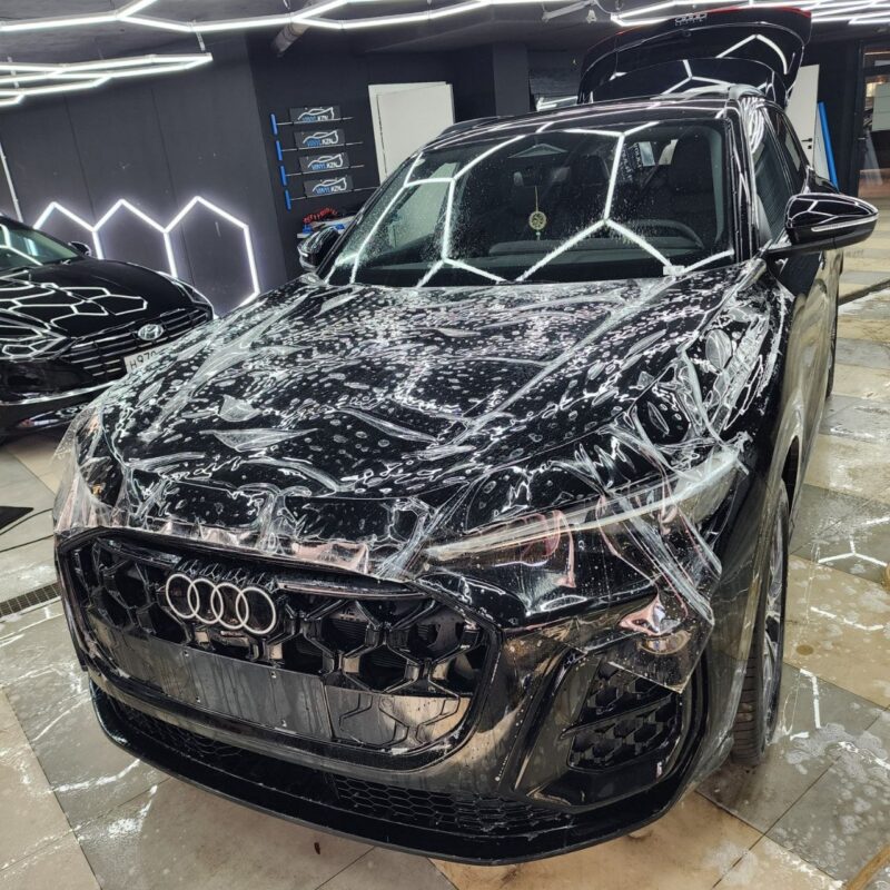 Audi Q5 в последнем рестайлинге, здесь мы защитили прозрачной полиуретановой плёнкой капот, бампер, фары, передние крылья, стойки возле лобового, часть крыши, зеркала, под ручками, пороги, погрузочную зону заднего бампера, черные глянцевые стойки дверей. Защитили все мониторы матовой полиуретановой плёнкой. Установили защитную сетку под бампер.