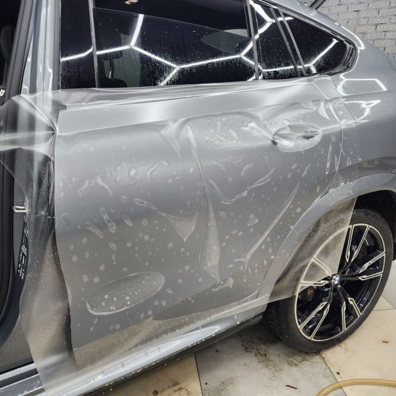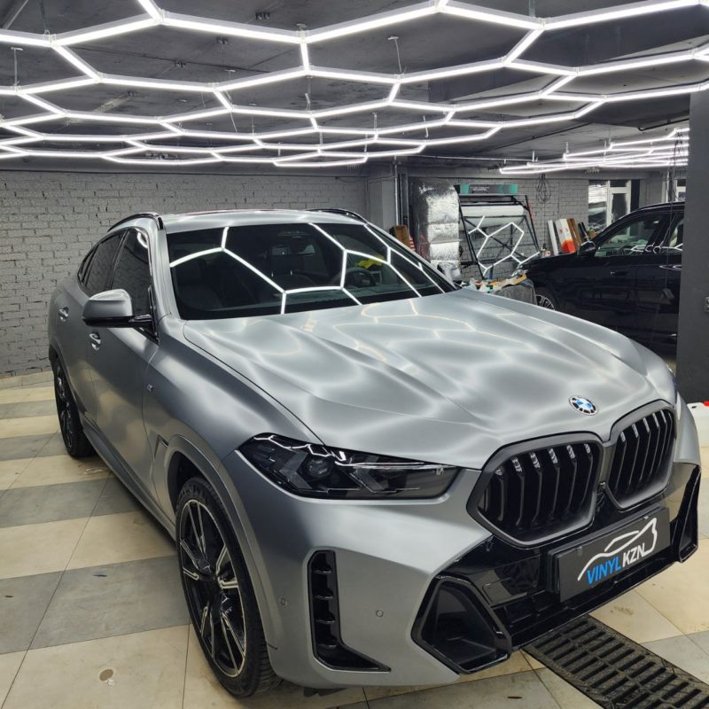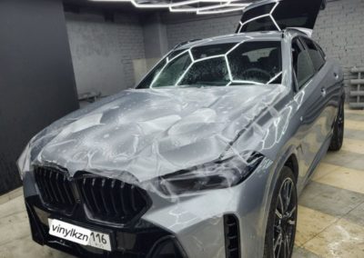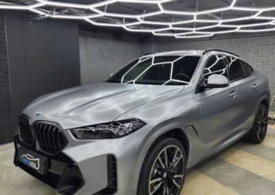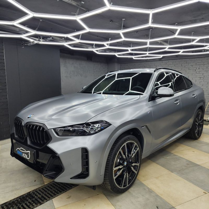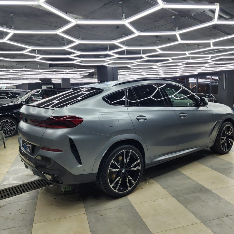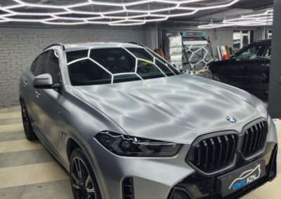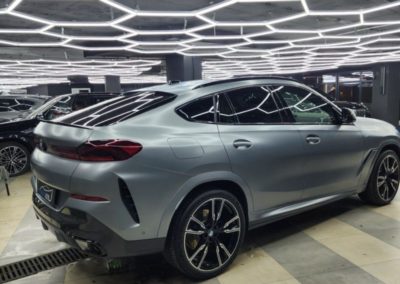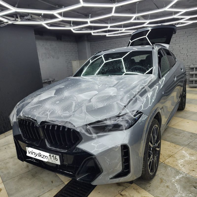 BMW X6 — забронировали кузов прозрачной матовой полиуретановой плёнкой сатин. Черные глянцевые элементы оклеили прозрачной полиуретановой плёнкой. Экран в салоне и зону акпп так же защитили. Лобовое забронировали полиуретановой плёнкой для стёкол.