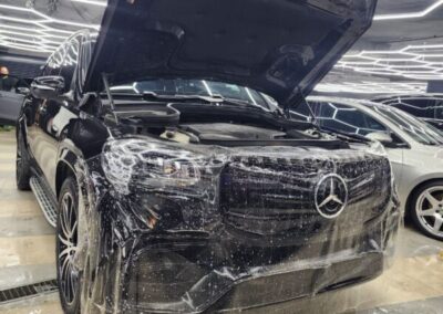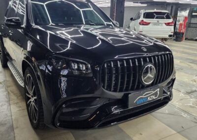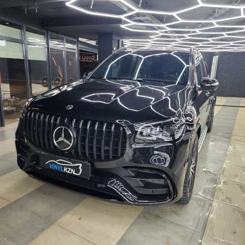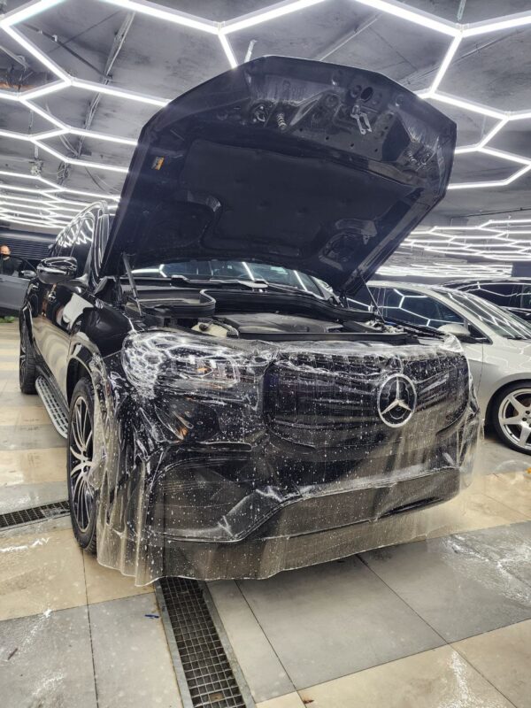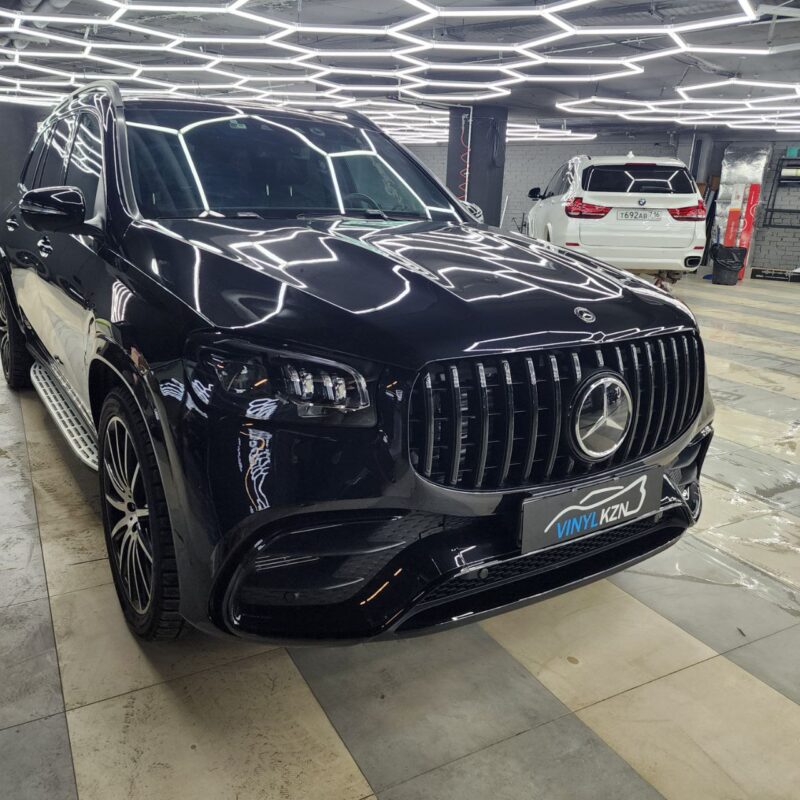Mercedes GLS оклеили передний бампер полиуретановой плёнкой. По желанию клиента, процедуры были выполнены без разбора.