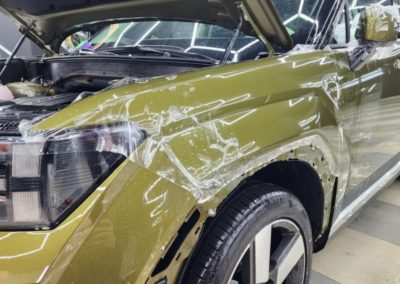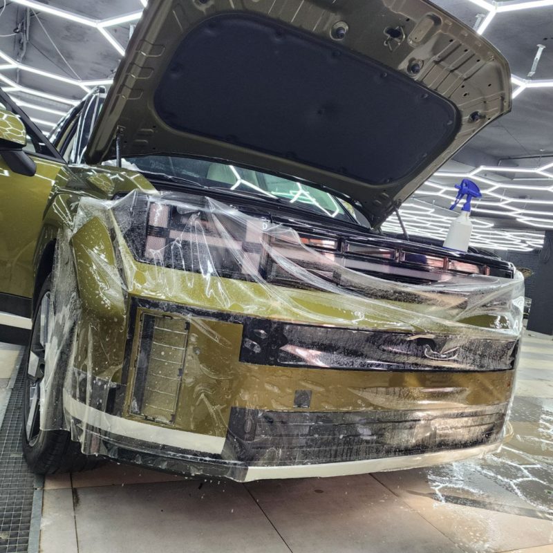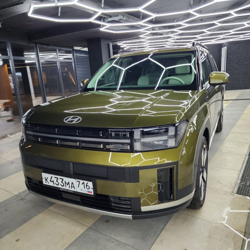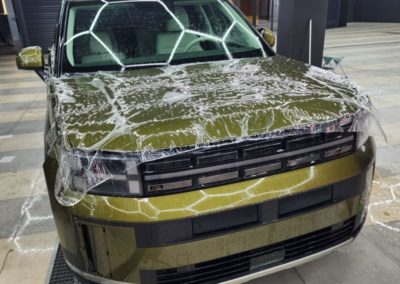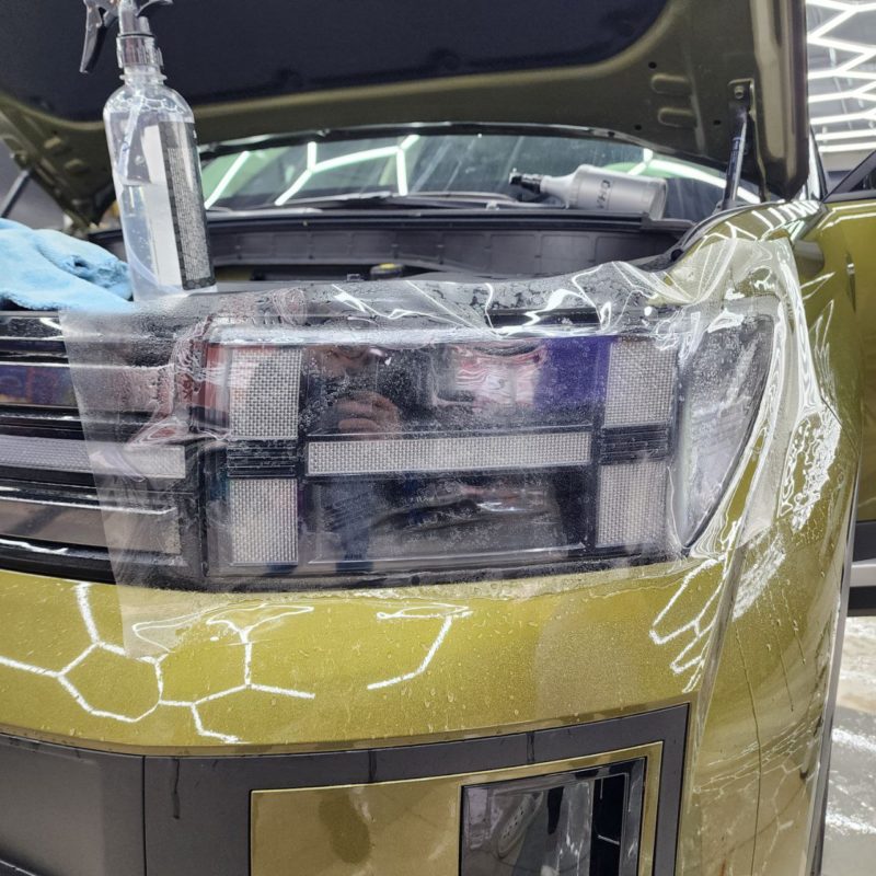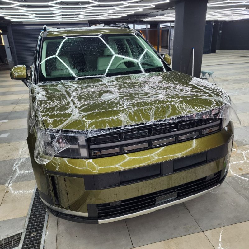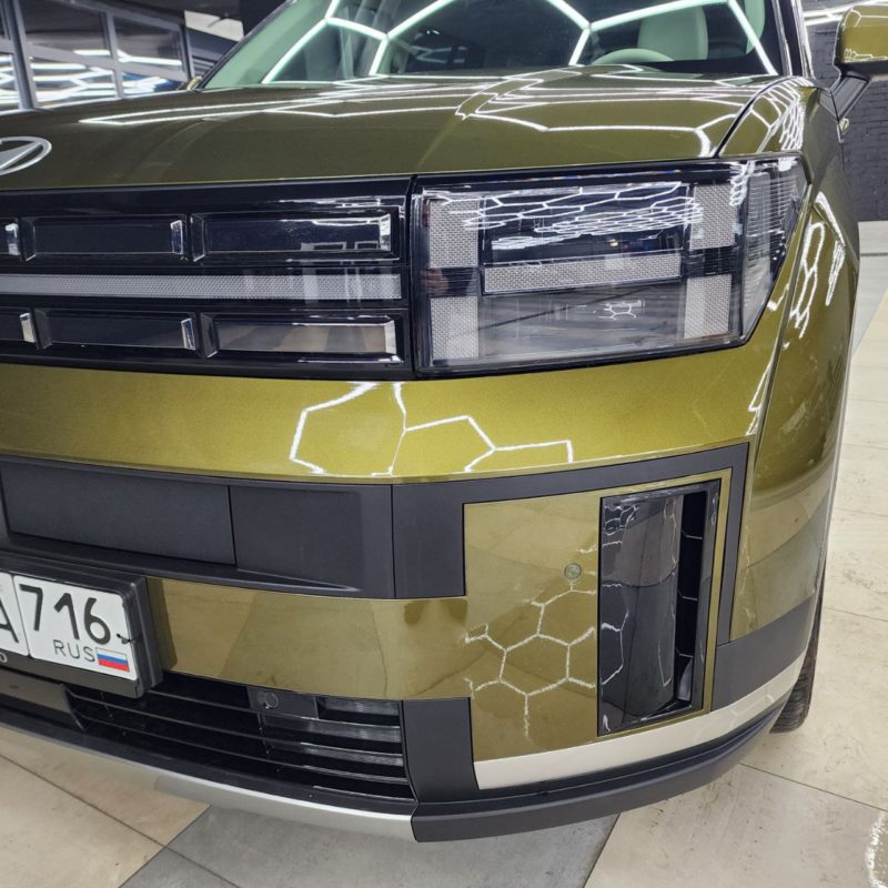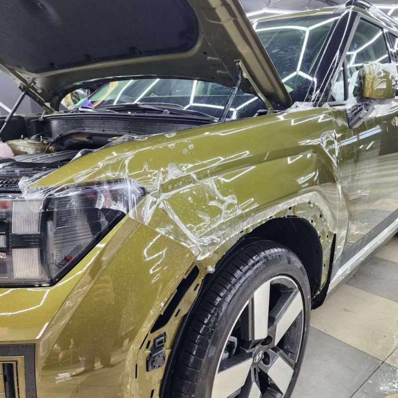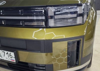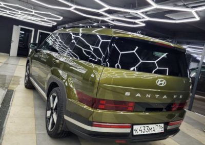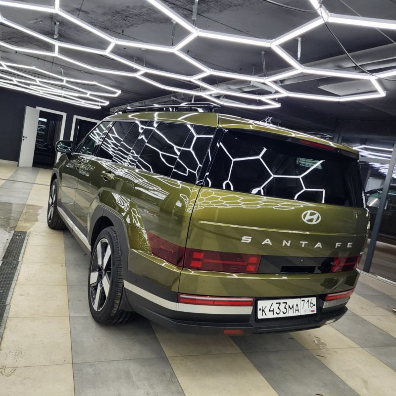 Hyundai SantaFe сделали комплексное бронирование кузова, защитили полиуретановой плёнкой капот, бампер, фары, передние крылья, стойки возле лобового, часть крыши, зеркала, под ручками, пороги, погрузочную зону заднего бампера. Те самые основные зоны риска повреждения по привлекательной цене.