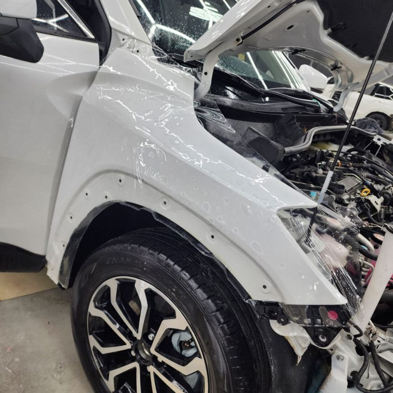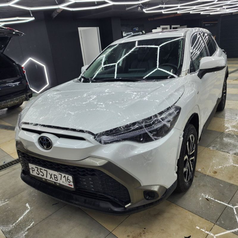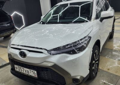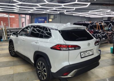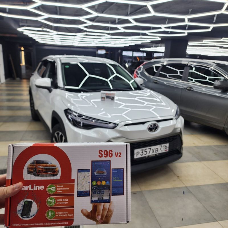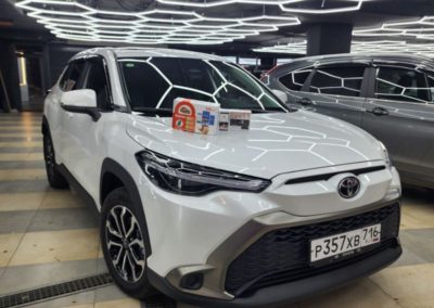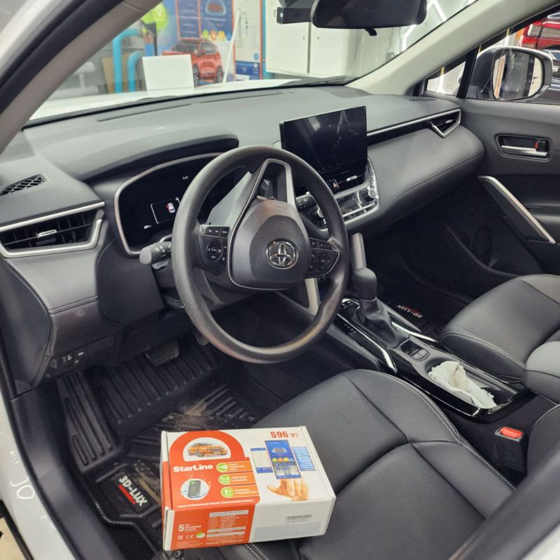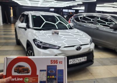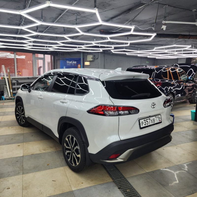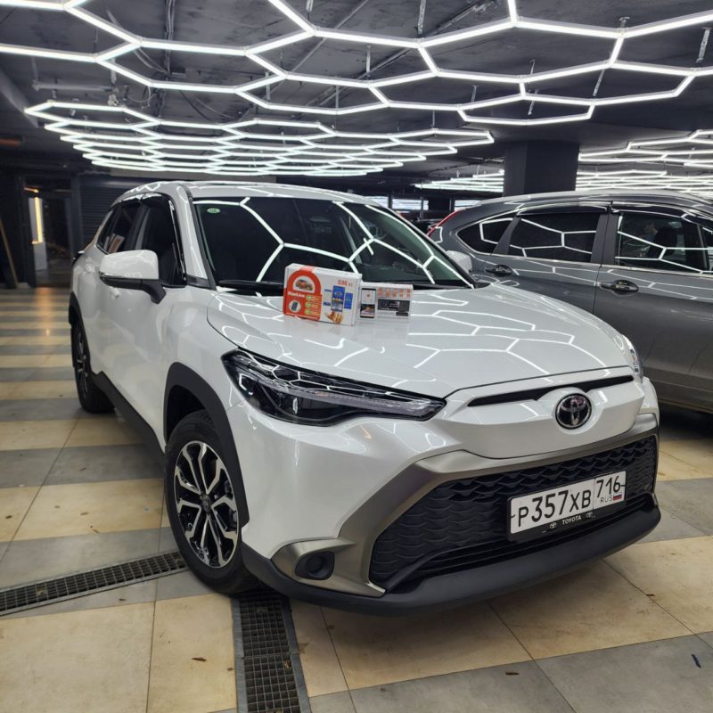 Toyota Frontlander (corolla cross) установили охранный комплекс StarLine S96 GSM. Заменили зеркала заднего вида на зеркала с обогревом. Сделали скрытую проводку питания регистратора. Бронирование полиуретановой плёнкой капота, бампера, фар, передних крыльев, стоек возле лобового, крыши, зеркал, под ручками, порогов. Затонировали заднюю часть автомобиля плёнкой Llumar ATR. Установили брызговики.
